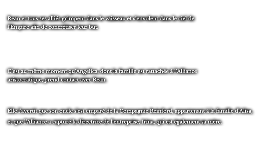 Rean et tous ses alliés grimpent dans le vaisseau et s’envolent dans le ciel de l’Empire afin de concrétiser leur but. C’est au même moment qu’Angelica, dont la famille est rattachée à l’Alliance aristocratique, prend contact avec Rean. Elle l’avertit que son oncle s’est emparé de la Compagnie Reinford, appartenant à la famille d’Alisa, et que l’Alliance a capturé la directrice de l’entreprise, Irina, qui est également sa mère.
