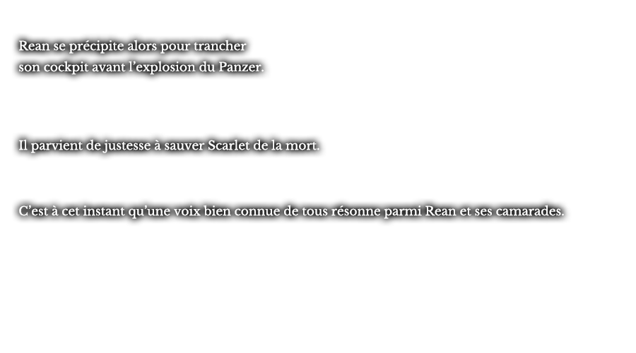 Rean se précipite alors pour trancher son cockpit avant l’explosion du Panzer. Il parvient de justesse à sauver Scarlet de la mort. C’est à cet instant qu’une voix bien connue de tous résonne parmi Rean et ses camarades.